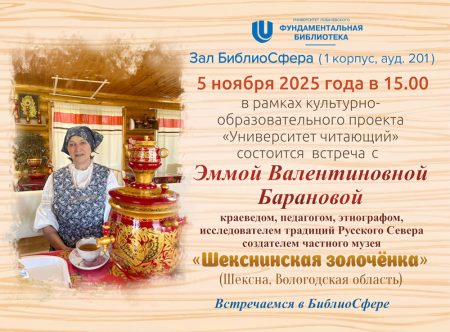 Фундаментальная библиотека ННГУ в рамках культурно-образовательного проекта «Университет читающий» приглашает всех желающих 5 ноября в 15.00 в зал БиблиоСфера (корп ...