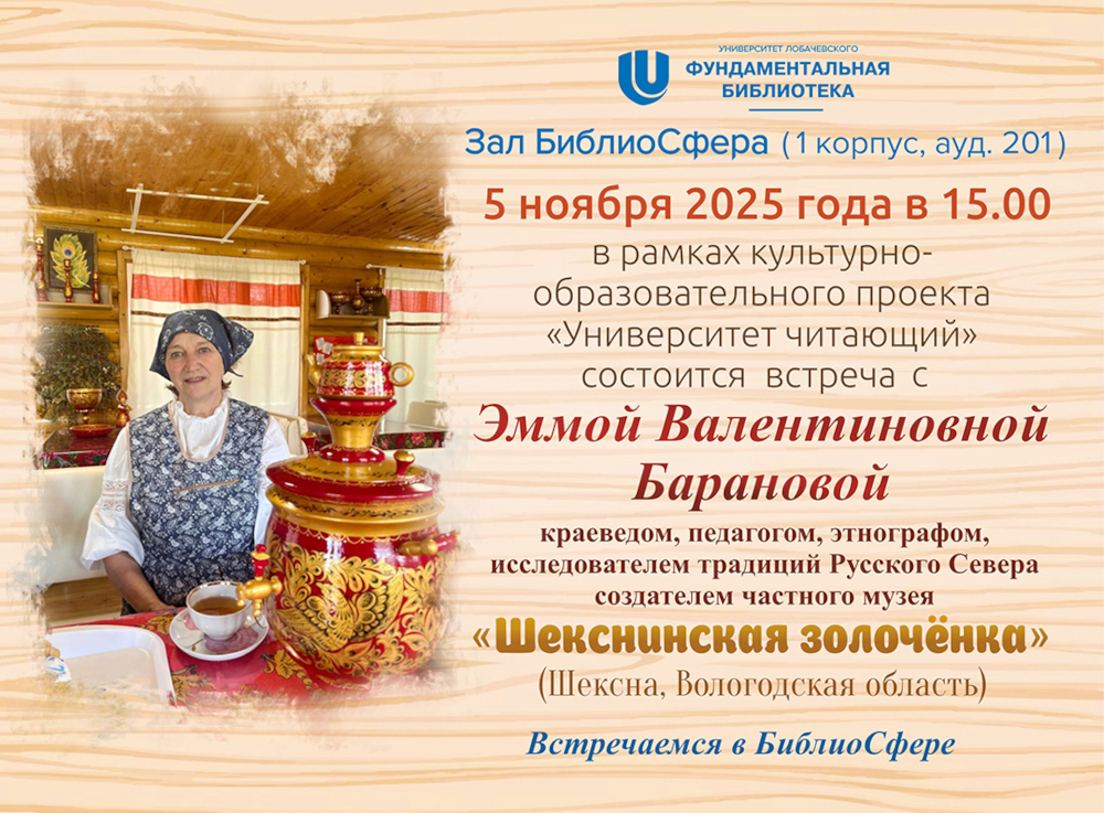 Фундаментальная библиотека ННГУ в рамках культурно-образовательного проекта «Университет читающий» приглашает всех желающих 5 ноября в 15.00 в зал БиблиоСфера (корп. 1, к. 201) на встречу с краеведом, педагогом, этнографом, создателем частного музея «Шекснинская золочёнка» Э. В. Барановой (Шексна, Вологодская область). Читать дальше …