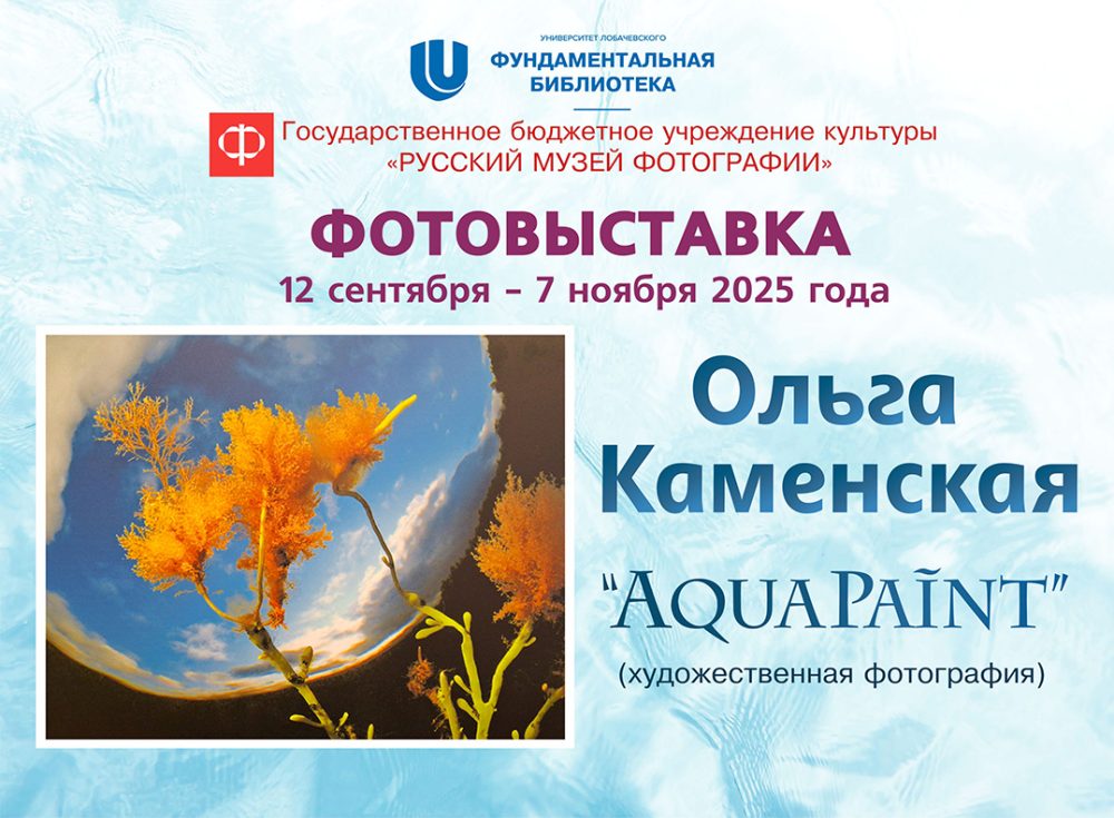 В Конференц-центре Фундаментальной библиотеки с 12 сентября по 7 ноября 2025 года состоялась выставка фотографий «AquaPaint» из коллекции известного фотографа Ольги Каменской. Выставка была организована в партнерстве с Русским музеем фотографии.